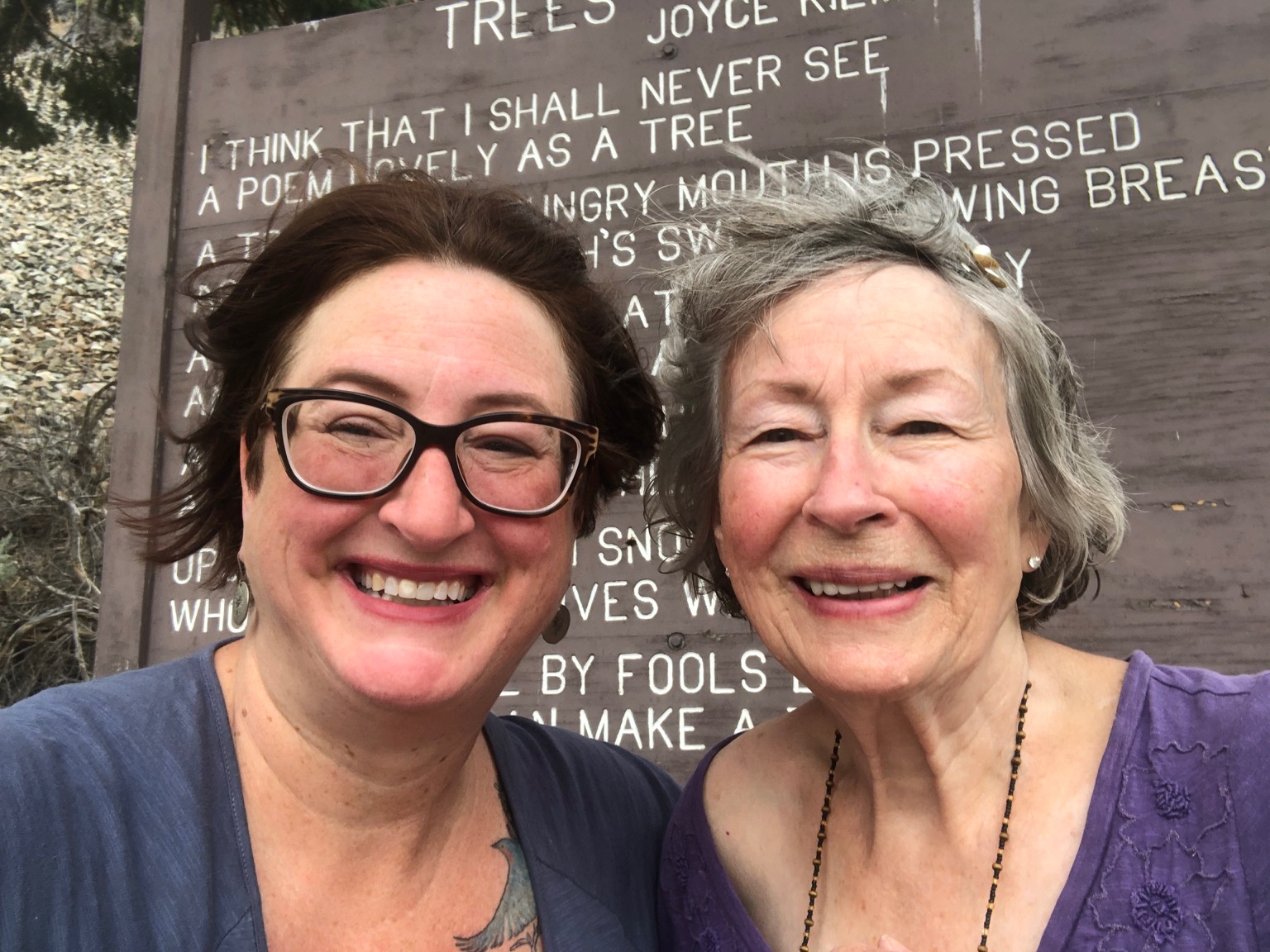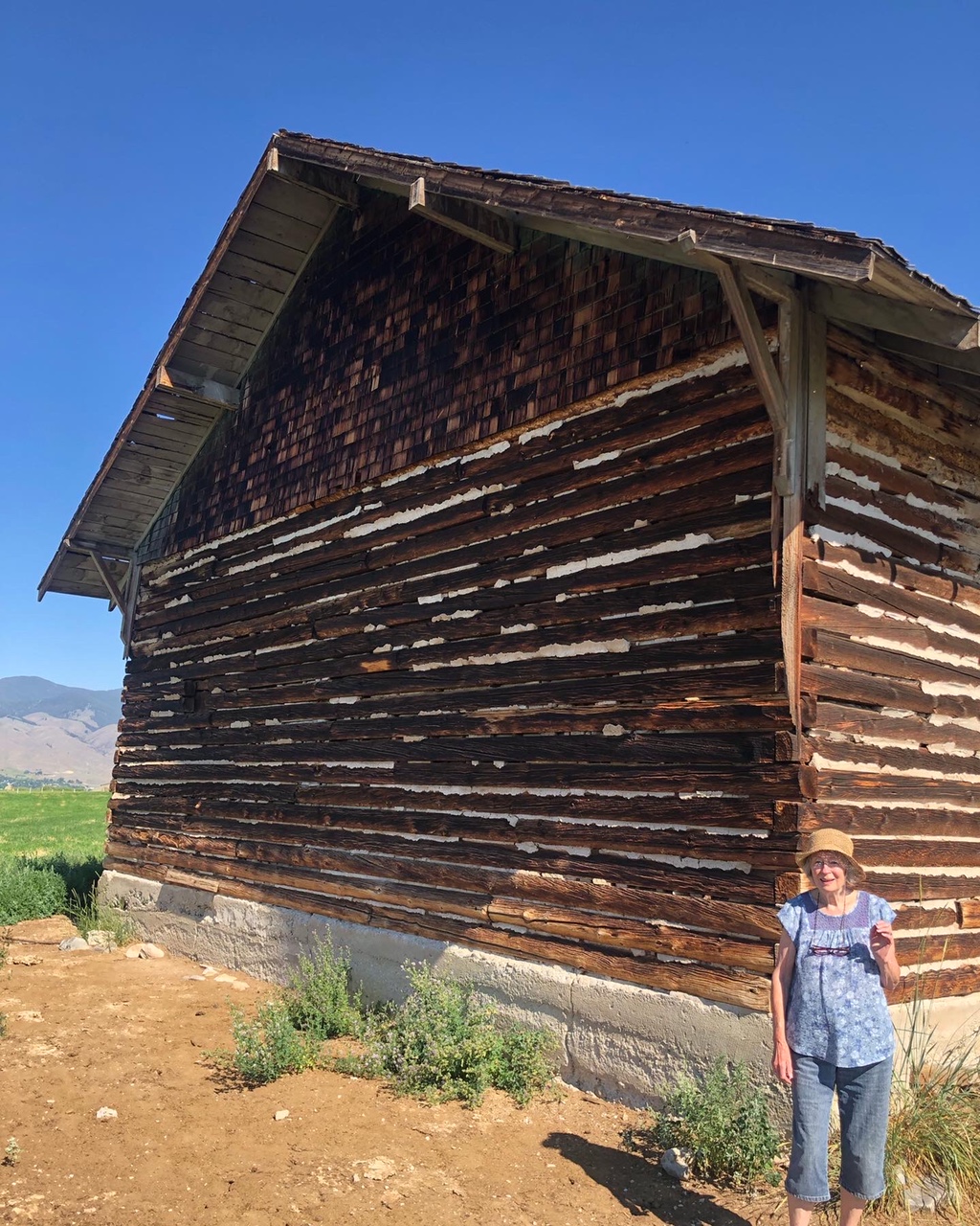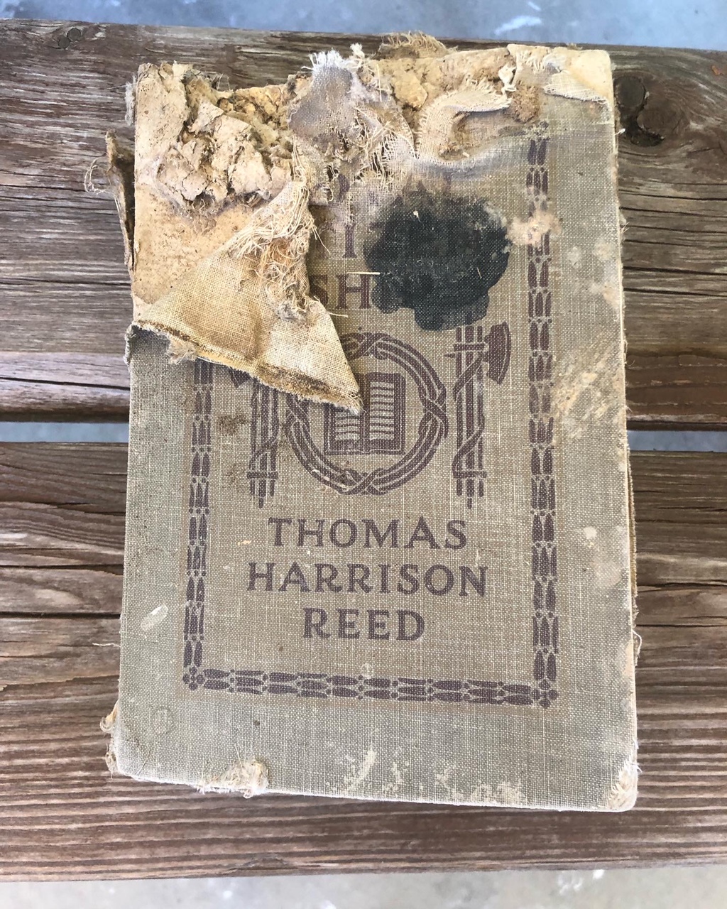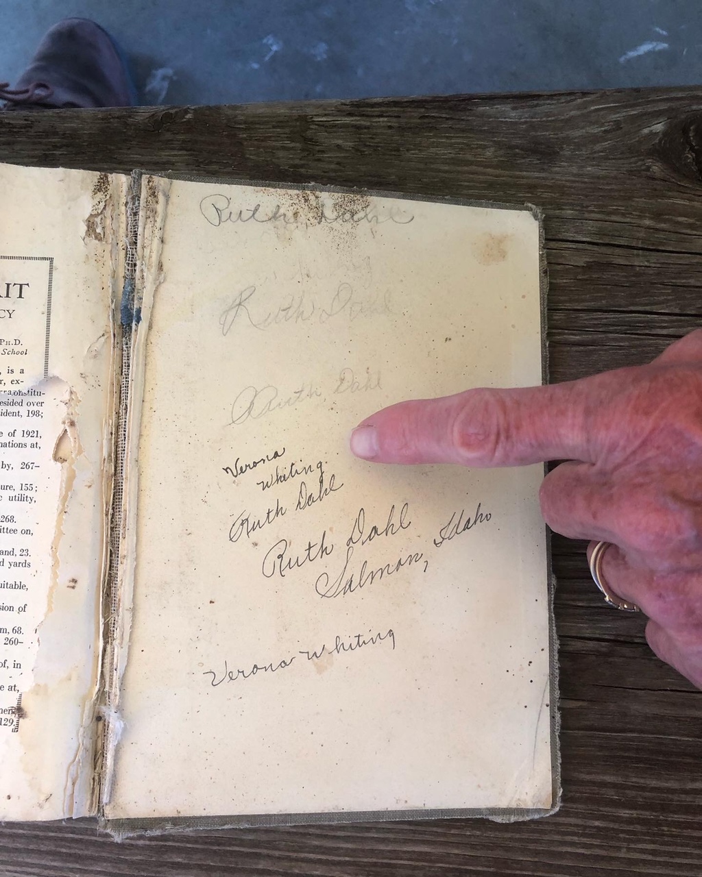 in the morning, we visited what we heard was the old schoolhouse on kirtley creek- a massive roughcut lumber and log creation circa 1928.  right before we left, the owner stopped by and said we should check out some old books that were still in the back of the building.  leon (age 80+ and 6-foot something) jumped the fence and scoured around until he found it:  a schoolbook from 1928 with aunt verona and our friend ruth’s names handwritten inside the back cover.  in that delicate cursive of the time.  the ladies squealed with joy.  a stroke of provenance.