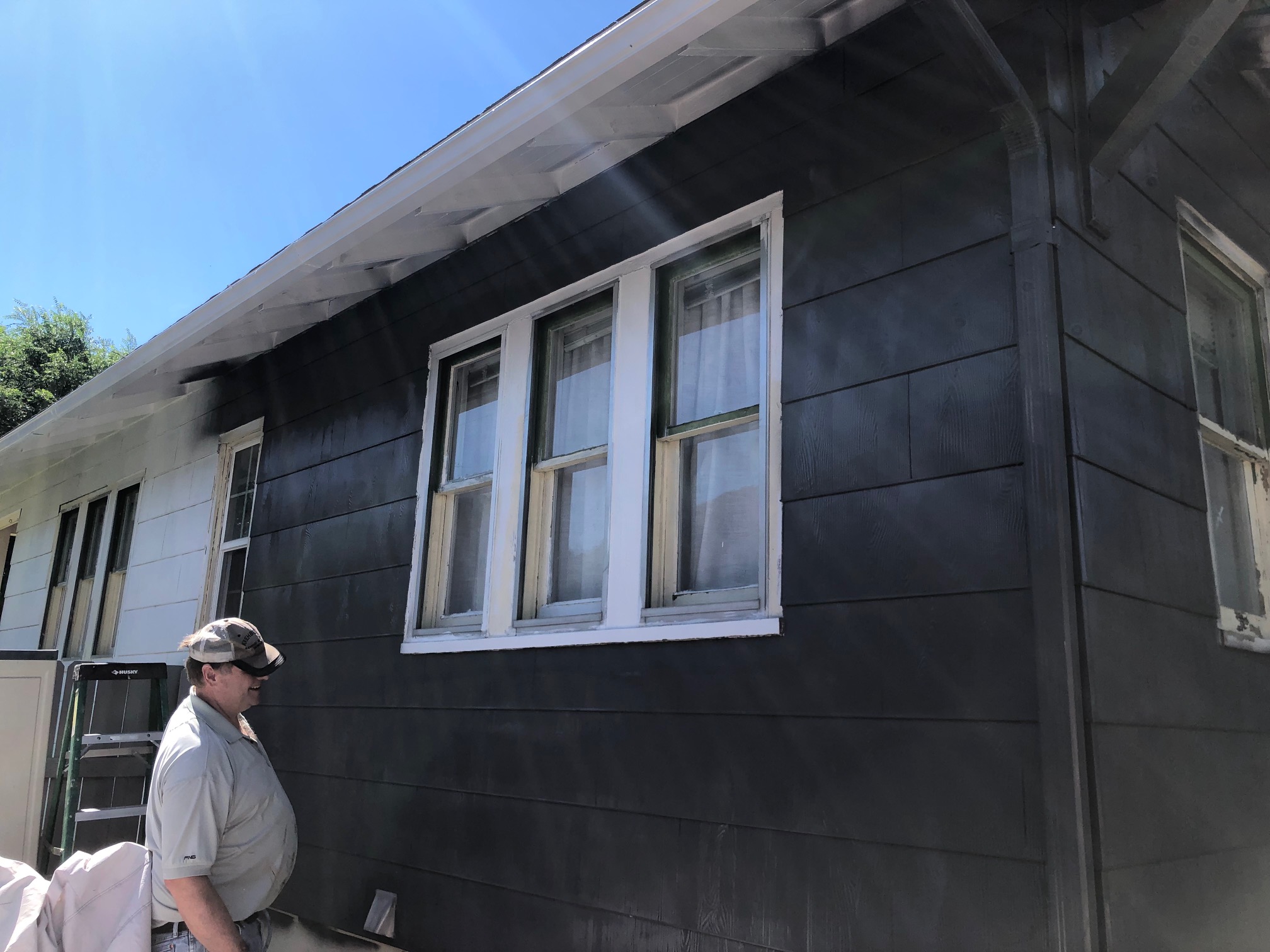 ever since i bought my 1940’s bungalow about 9 years ago, i’ve wanted to paint it. the cream/dirty white aesthetic did nothing for it’s personality. i knew there was potential, and it was up to me to realize it. (this house ain’t gonna paint itself…) i didn’t realize how rough the trim was until i started investigating this spring. the siding is a vintage cement board that had never been painted, so it was still in great condition. it just needed a good power wash and a nice coat of primer and it was ready to paint. not having to scrape the siding was a true blessing. my crew showed up with an industrial paint sprayer and in about 3 hours (with 6 people)- the base was magically transformed!